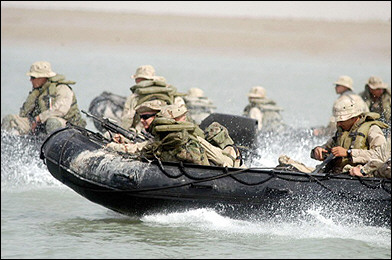 US Marines with the Bravo Company, 1st Battalion, 1st Marine Division out of Camp Pendelton, Ca. prepare to board a tanker ship at Khor Zubair, near Umm Qassar, southern Iraq, while conducting oil smuggling control operations with British forces on Saturday, Oct. 18, 2003. (AP Photo/Gustavo Ferrari)