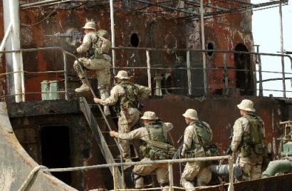 US Marines with the Bravo Company, 1st Battalion, 1st Marine Division out of Camp Pendelton, Cal. search a tanker ship at Khor Zubair, southern Iraq, while conducting oil smuggling control operations with British forces on Saturday, Oct. 18, 2003. (AP Photo/Gustavo Ferrari)