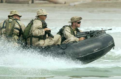 U.S. Marines prepare to board a ship during an anti-smuggling operation outside the port of Umm Qasr, in southern Iraq Sunday Oct. 19, 2003. Coalition forces have mounted a campaign to combat the smuggling of oil and other goods from Iraq's southern ports. Officials estimate that 2000 tons of oil, the equivalent of 65 road tanker loads, were being smuggled out of Umm Qasr each day, before the anti-smuggling operation began two weeks ago. (AP Photo/Greg Baker)